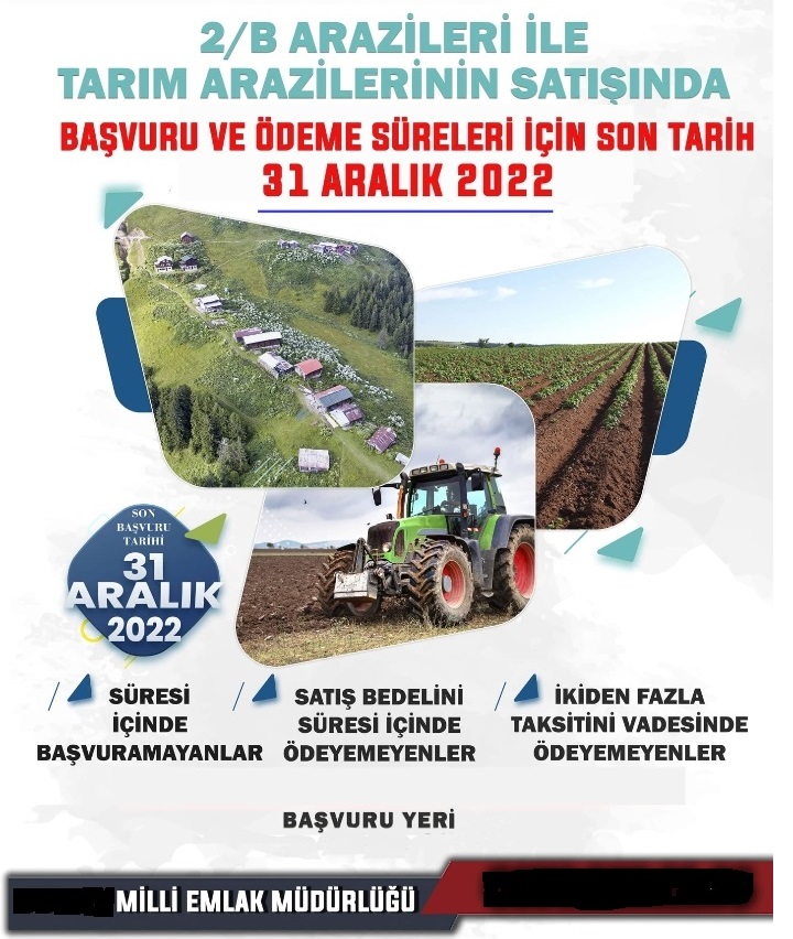 2/B Arazileri İle Tarım Arazilerinin Satışında Başvuru ve Ödeme Süreleri İçin Son Tarih 31.12.2022
